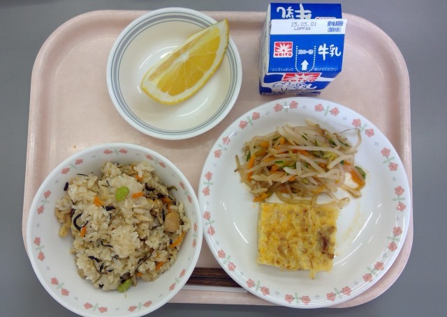 鶏ひじきおこわ、切干大根の卵焼き、野菜のコチュジャンかけ、河内晩柑、牛乳
