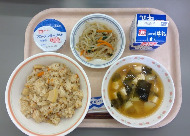 4月28日(月) 公開日 2025/04/28 更新日 2025/04/28 給食室 たけのこごはん、野菜のごまだれかけ、みそ汁、フローズンヨーグルト、牛乳 今日のたけのこごはんは、生のたけのこを使って作りました。調理室で、米ぬかと唐辛子を使ってたけのこを下茹でしました。 子どもたちは、新鮮な春の旬を味わって食べていました。