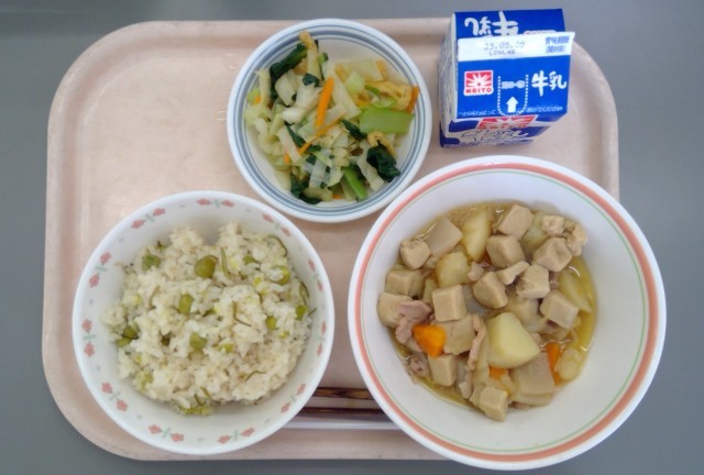 すき昆布とグリンピースのごはん、肉じゃがうま煮、カリカリ油揚げのおひたし、牛乳