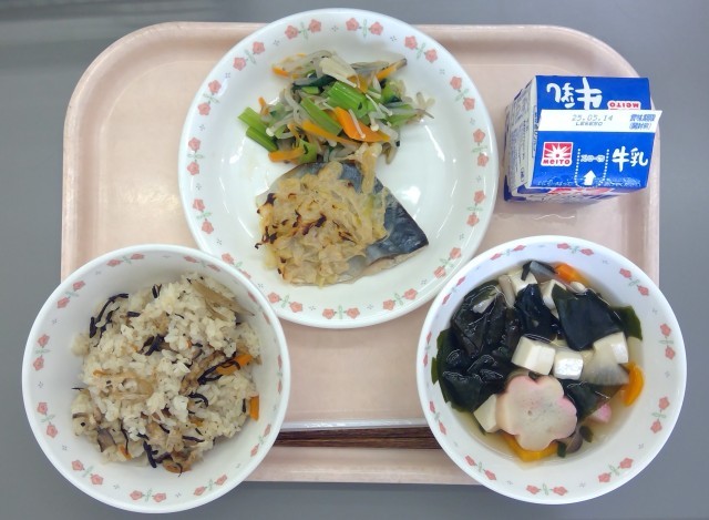 ひじきごはん、魚のネギ塩こうじ焼き、おひたし、豆腐汁、牛乳
