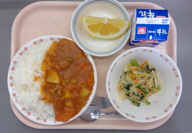 ハヤシライス、ツナサラダ、美生柑(みしょうかん)、牛乳