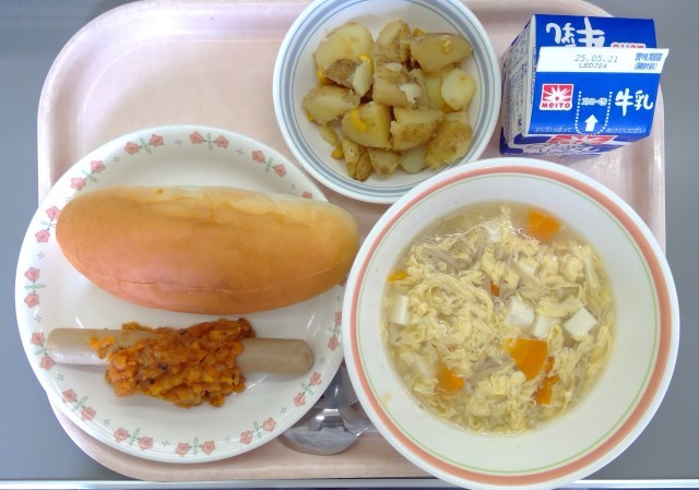 セルフウィンナーサンド、新じゃがバターコーン、卵スープ、牛乳