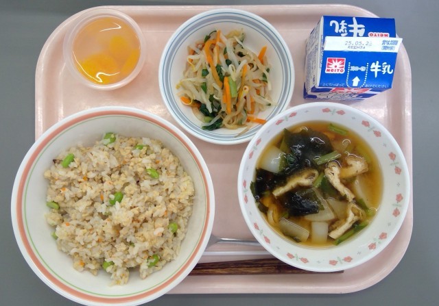 高野豆腐のそぼろごはん、糸寒天と切干大根の和え物、かぶのみそ汁、フルーツゼリー、牛乳
