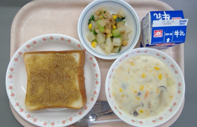 セサミトースト、コーンシチュー、ひよこ豆のサラダ、牛乳