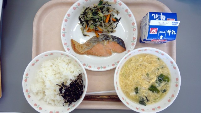 ごはん、ひじきふりかけ、魚の香味焼き、野菜の磯香あえ、むらくも汁、牛乳
