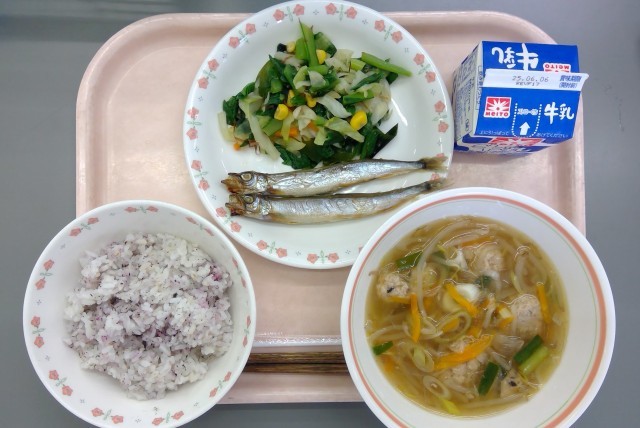 ゆかりごはん、焼きししゃも、野菜とわかめのあえ物、肉団子と春雨のスープ、牛乳