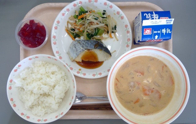 ごはん、魚の梅肉焼き、からしあえ、豆乳入りみそ汁、あじさいゼリー、牛乳