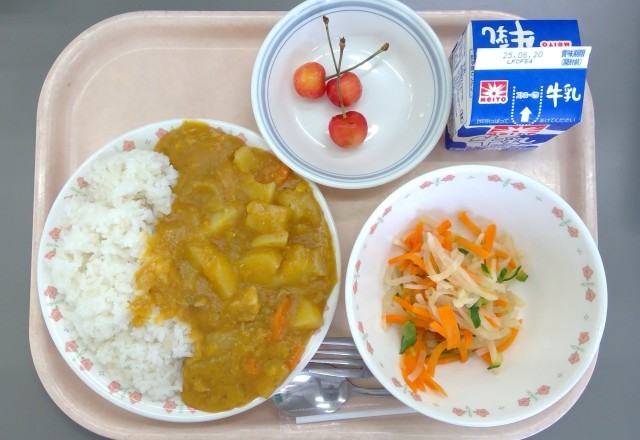 チキンカレーライス、シャキシャキ野菜、さくらんぼ、牛乳