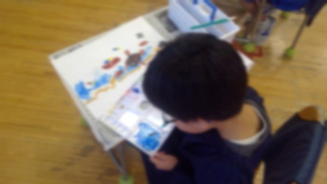 自分たちが楽しいと感じたことをクレヨンを使って描き、その上に絵の具で背景を塗りました。