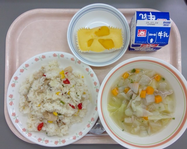 カラフルピラフ、田舎風豆スープ、黄桃のヨーグルトケーキ、牛乳