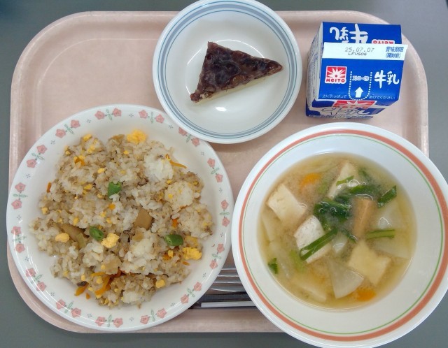 今月で1年の前半が終わりますね。神社では6月30日に「夏越しの祓」という行事が行われます。半年間の厄を払い、残り半年の無病息災(病気をせず元気であること)を祈ります。「丹後のまつぶた寿司」は、京都の丹後地方で、ハレの日(お祝いの日)によく作られる郷土寿司です。「まつぶた」と呼ばれる、もちを並べる浅い木の箱にすしをしきつめて作ることから、この名前で呼ばれています。さばの甘めのそぼろを、すし飯の上にしきつめるのが特徴です。また、京野菜である九条ネギを使った「九条ネギの味噌汁」や、「水無月」という、京都発祥の和菓子も作りました。水無月の上にのっている小豆は、悪魔ばらいの意味があり、三角の形は暑さをしのぐ氷を表しています。給食を食べて、みんなで1年の後半の無病息災を願いました。
