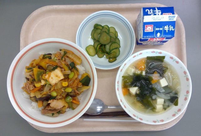 夏野菜の豚キムチ丼、きゅうりの中華味、わかめスープ、牛乳
