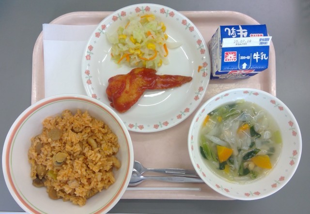 今日はアメリカ料理でした。ジャンバラヤは、アメリカの南部の料理です。アメリカの南部では、よくスパイシーなものを食べます。ケイジャン料理といいます。スペインや、アフリカから伝わった食材や料理が混ぜ合わさって、独特の食文化ができたそうです。バッファロー・ウィングは、ニューヨーク州にあるバッファローという町で生まれた料理です。揚げたり焼いたりした手羽先に、辛いソースをからめます。給食では辛さをおさえた味付けにしました。コールスローサラダは、オランダ語で「キャベツサラダ」を意味する「コールスラ」から生まれたそうです。フライドチキンには欠かせないサラダです。