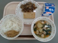 里芋ごはん、お好み焼き風卵焼き、大根と豆腐のみそ汁、りんご、牛乳