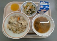 鶏ごぼうごはん、根菜チップス、なすと豆腐のみそ汁、みかん、牛乳