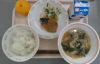 ごはん、魚のつけ焼き、キャベツときゅうりのしらす和え、呉汁、ぶどうゼリー、牛乳