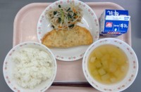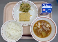 ごはん、千草焼き、切干大根ときゅうりのごま酢和え、豚汁、牛乳