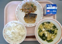 ごはん、サバのヤンニョムカンジャン、白滝のチャプチェ風、卵スープ、牛乳 ヤ...