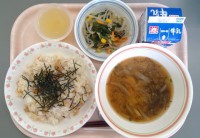 たこめし、もやしとわかめのあえ物、もずくとちくわのみそ汁、りんごゼリー、牛乳