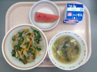 スタミナ丼、ビーフンスープ、すいか、牛乳
