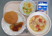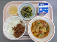 ごはん、おかかふりかけ、トマト肉じゃが、ひじきサラダ、はちみつレモンゼリー、牛乳