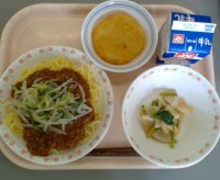 ジャージャー麺、かぶのサラダ、もちもちポテト、牛乳