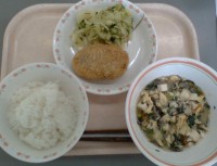 ごはん、ひじきの和風コロッケ、キャベツと昆布の浅漬け、もずく入りかきたま汁、牛乳