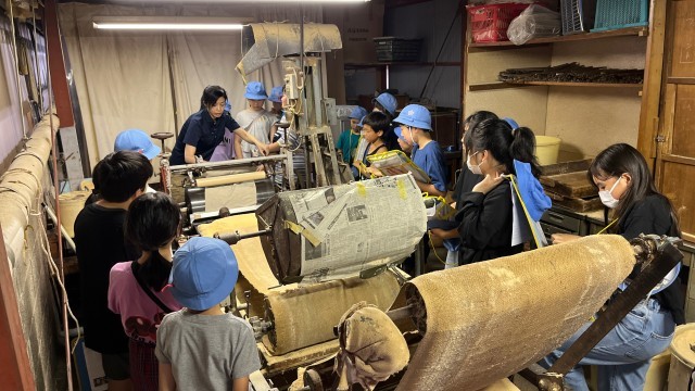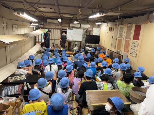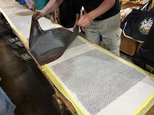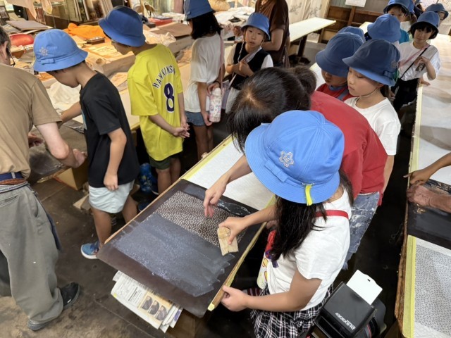 4年生社会科見学 公開日 2025/07/14 更新日 2025/07/14 学校日記 4年生が社会科見学に行きました。まず最初は、東京の伝統工芸の1つ、東京染小紋の工場の見学です。主に江戸時代、武士の裃(かみしも)に小紋染めが取り入れられて発展しました。その歴史や染めの方法を聞き、実際に体験をしました。1人1人が型付けをしました。型紙をのせ、ヘラで糊(目色糊)を塗る作業です。その後工場の人がしごいて蒸して、水洗い、乾燥をして、夏休み明けに1人1人に送ってくれます。お楽しみに! +3