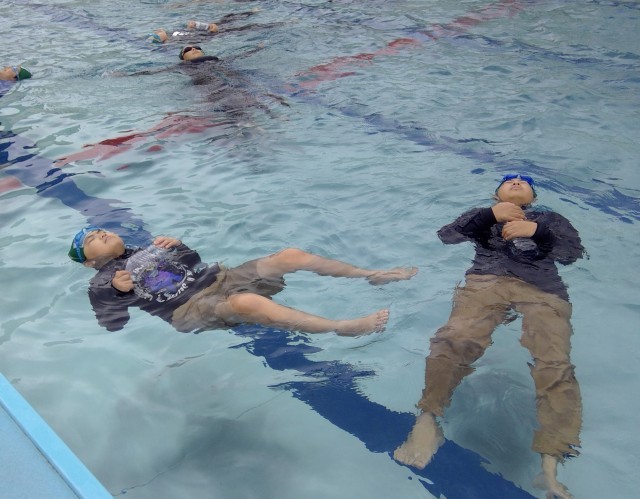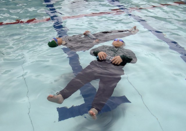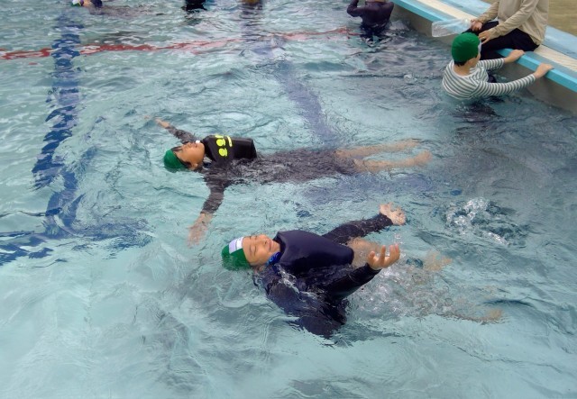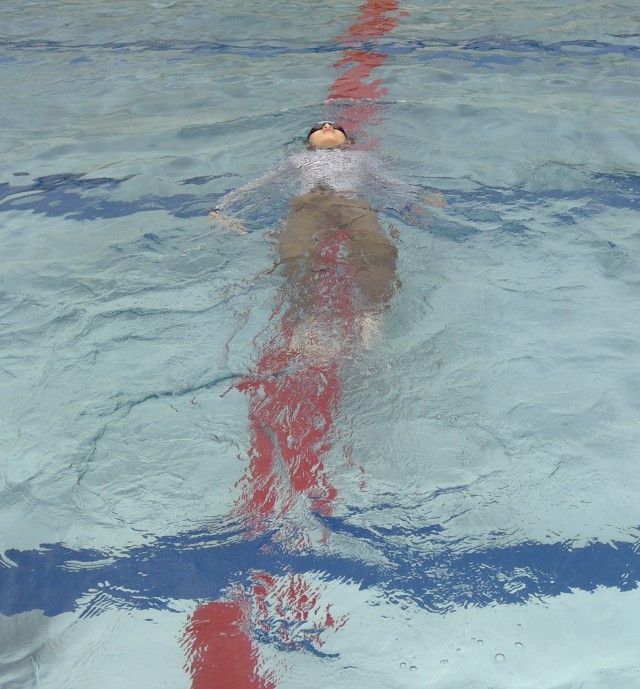 まずは水の中でクロール、平泳ぎ、背泳ぎなどをしてみて、衣服のままだと腕が上手く上げられないことがわかり、平泳の方が腕が楽であることを確認しました。