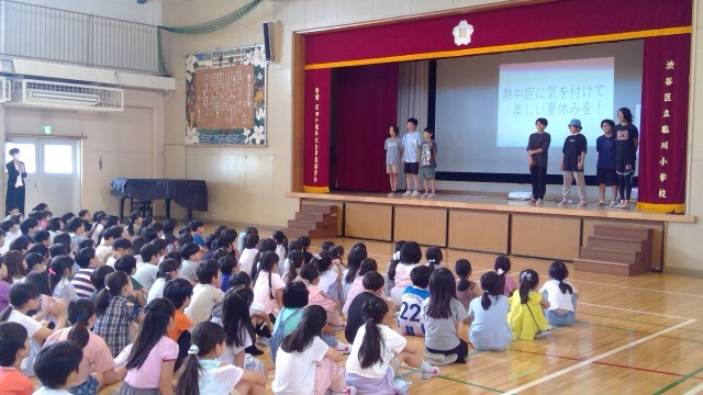 全校朝会では生活指導主任から夏休みの過ごし方を伝えました。その後、6年生が取り組んでいるシブヤ未来科の「めざせ!熱中症インフルエンサー」の広報部から、全校にお知らせをしたい!という申し出があり、この時間にお知らせをしてくれました。この夏の熱中症対策のために注意することの呼びかけやいろいろな提案をしてくれました。自主的なところがすばらしいです。