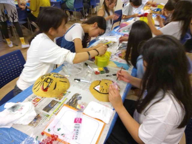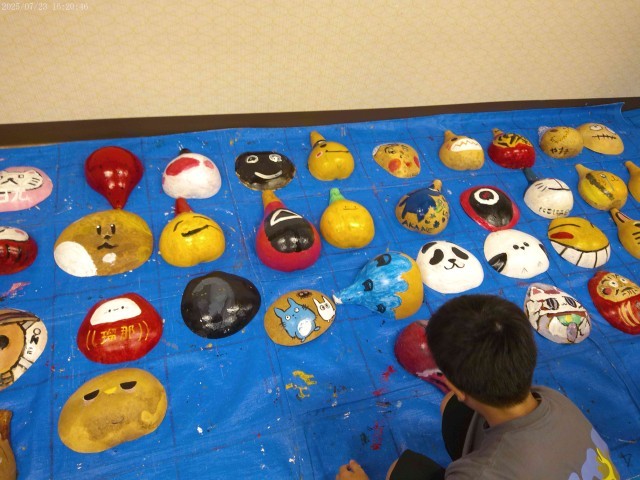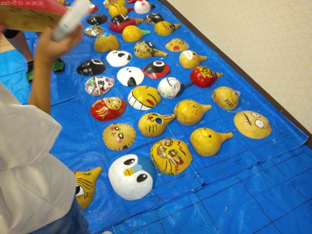 日光その9 公開日 2025/07/23 更新日 2025/07/23 学校日記 ホテルに戻り、15時30分から栃木県の伝統工芸、ふくべ細工の体験をしました。ふくべ細工とは、夕顔の実、果肉を取り除き、外側の皮の部分を乾かした材料に、絵を描いて飾ったり魔除けにしたりするものです。あらかじめ考えておいた下絵を描いて、穴を開けてもらい、絵の具で絵を描いたり塗ったりして完成しました。その後乾かしてニスを塗り、1週間ほどで学校に送ってくださるそうです。完成が楽しみです。 +1