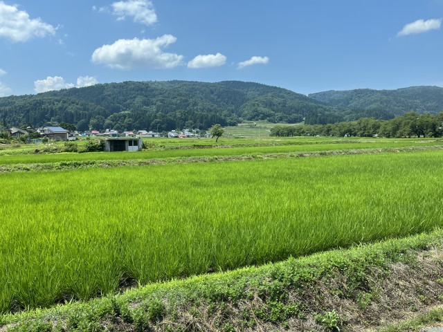 横川SAで2回目のトイレ休憩をしてからしばらく走り、高速を降りました。360°パノラマの青々とした田んぼの風景を見ながらやっと飯山に到着しました。