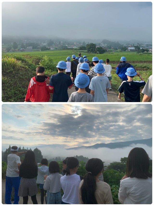 飯山その6 公開日 2025/07/27 更新日 2025/07/27 学校日記 おはようございます。2日目の清々しい朝です。朝からミンミンゼミが鳴いています。飯山の特徴の1つ、眼下に雲海が見られます。美しいです。宿ごとにラジオ体操、そして朝の散歩に出ました。静かな村に虫の声とともに子供たちの声が響いています。散歩中、田んぼにたくさんのカエルを見つけ捕まえています。この後は朝ごはんです。 +3