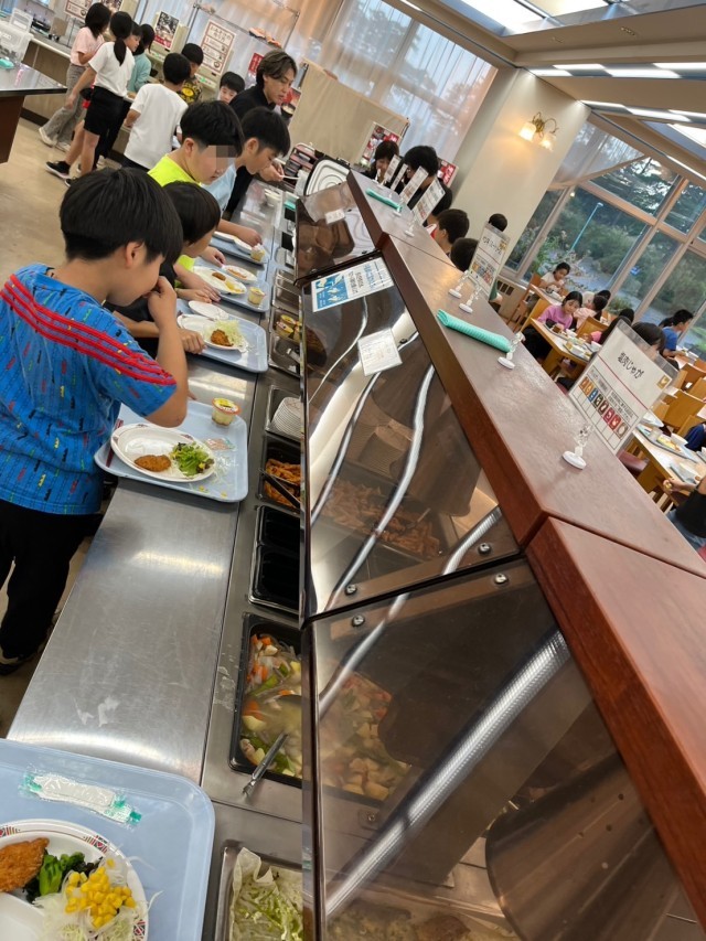 その後、そのまま夕飯の会場に行き、バイキングで好きなものを取ってグループごとに食べました。