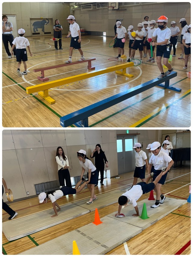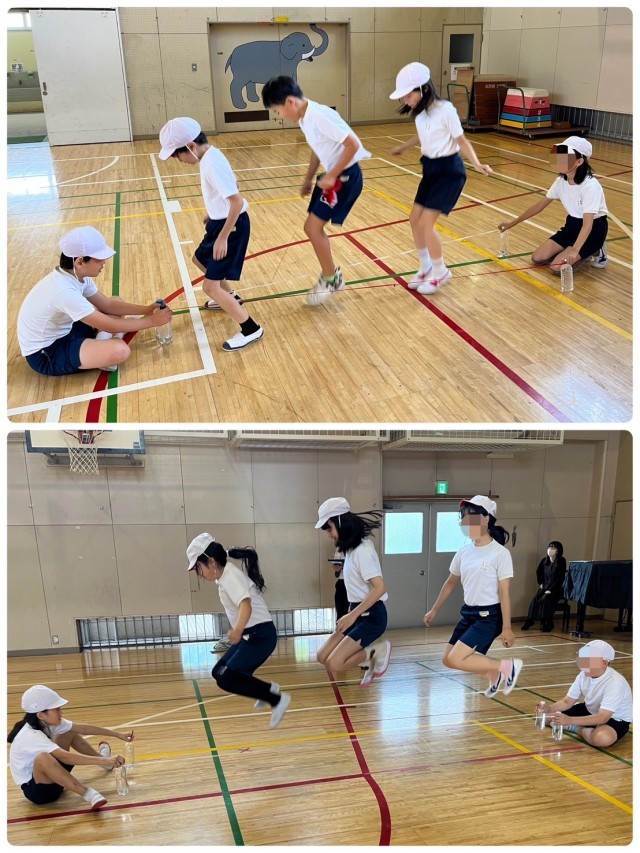 後半はペットボトルを使ったバンブーダンスです。ゴム紐を張り、グーパーパーのリズムに乗り、足を開いたり閉じたりしながらリズムよく動くことが求められます。子供たちから低い姿勢で跳ぶ、前後ろに回転しながら跳ぶなどの工夫が出され、上手に運動することができました。