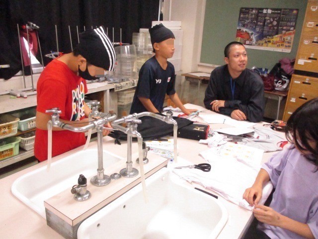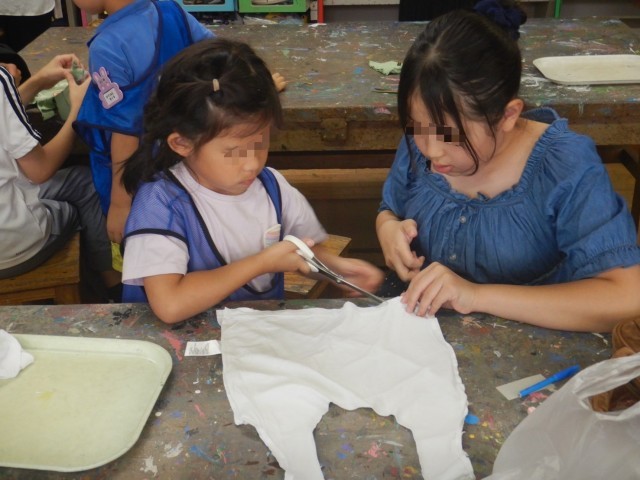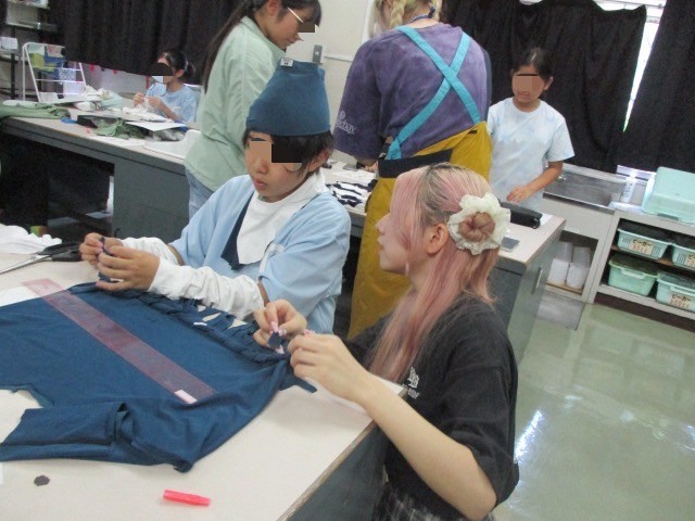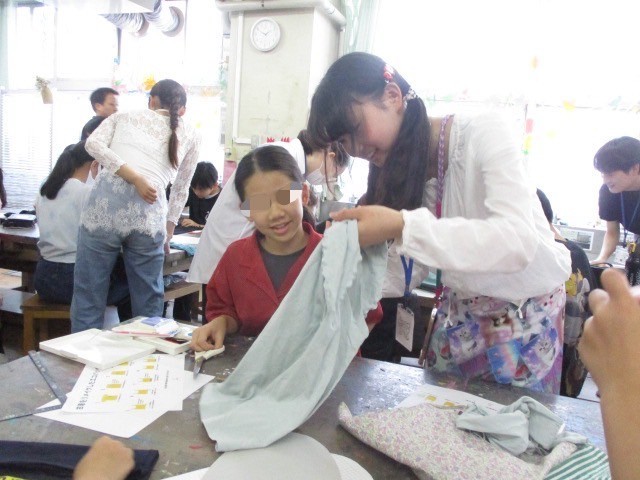 世界では毎年何万トンという量の洋服が捨てられていることを学び、サイズが小さくて切れなくなったTシャツを家庭から持ってきて、Tシャツでエコバックを作りました。文化服装学院さんの学生さんが、優しく作り方を教えてくれました。