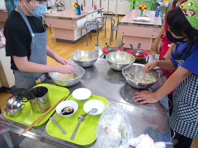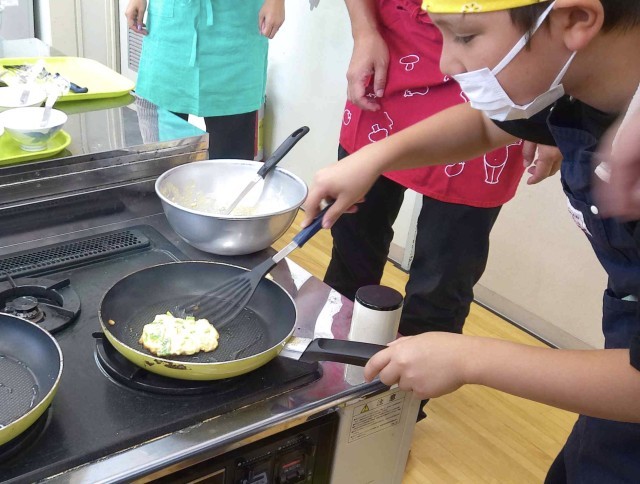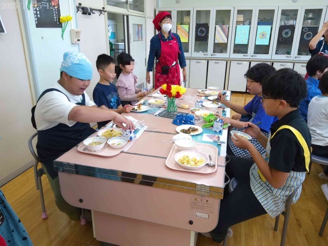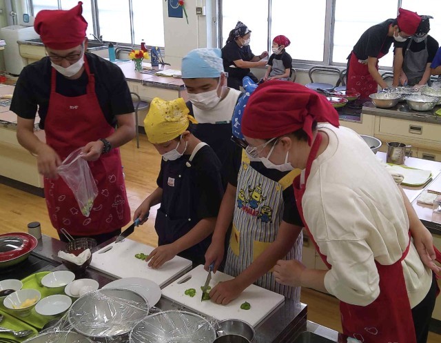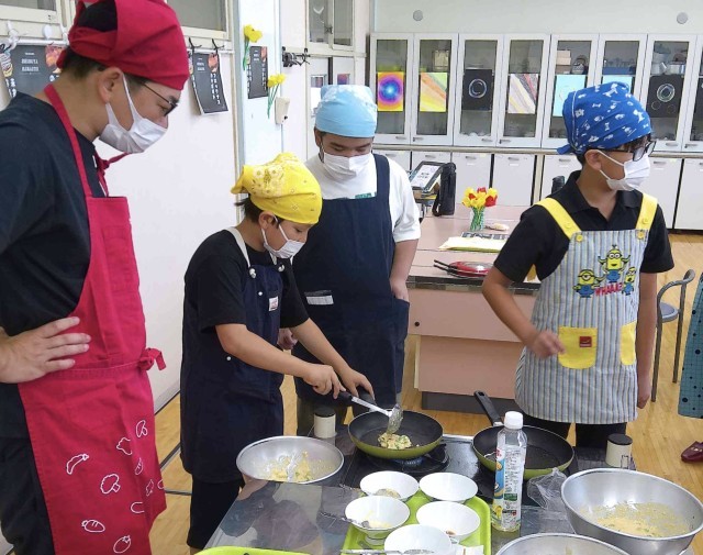 2つのグループに分かれ、料理のプロである企業の方々のサポートを受けながら、野菜を切ったり、油で焼いたりと手際よく作業を進めることができました。1・2年生からは「美味しい!」と大好評。実は野菜嫌いな子も、自分が作った料理をペロッと平らげていました。
