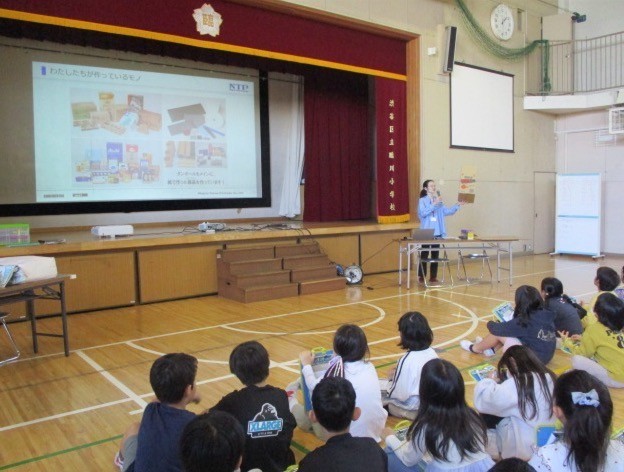 3年生で段ボールの特徴を知るために、段ボールを製造している「日本トーカンパッケージ」という会社に来ていただきました。