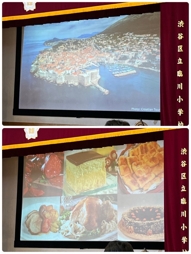 体育館で大使よりクロアチアの建物や景色や食べ物などの様々な文化を教えてもらいました。