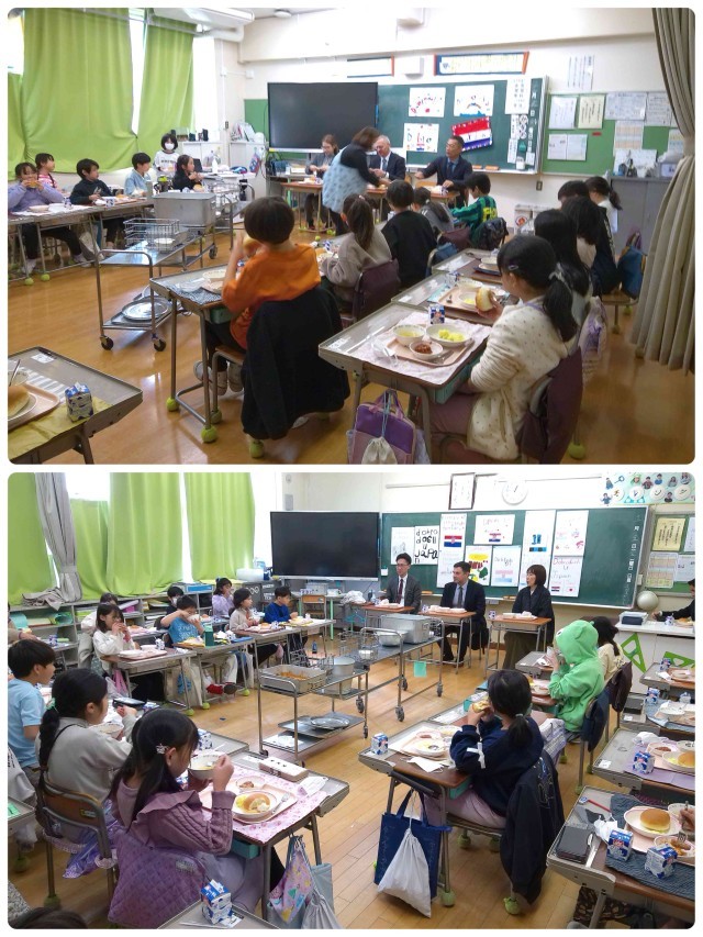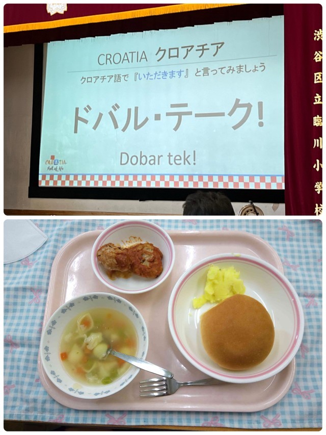 その後は給食交流です。メニューはもちろんクロアチア料理です。トマトソースミートボール、マッシュポテト、チキンラグースープです。