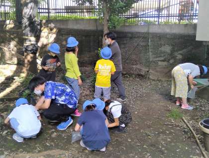 2組 秋さがしの学習で、ブドウや木の実、トンボやコオロギを見付けて観察しました。