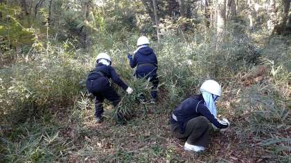 森の生き物が生きていくための手伝いとなる下草刈りをしたり、木の成長を妨げているツルを取ってリース作りをしたり、バッタやカマキリを見つける自然散策をしたりしました。