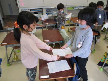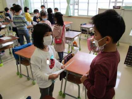 「よろしくね カード」に自分の名前を一生懸命に書いた子供たち。心を込めて「よろしくね」と渡しました。少し恥ずかしそうに、はにかみながらカードを受け取る姿がかわいらしいです。