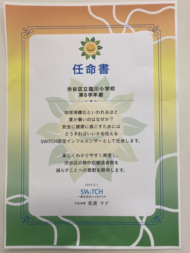 最後に、昨年から本校に関わってくださっている企業SWiTCHさんから熱中症インフルエンサーとして任命され、今後の活動について学年として目標をもち、取り組むことになりました。