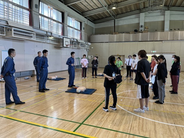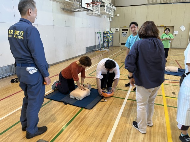 その前の日は、教職員がAEDを使って救急救命について実技研修を行いました。消防署の方に来ていただき、1人1人が心臓マッサージの方法や注意点などを学びました。