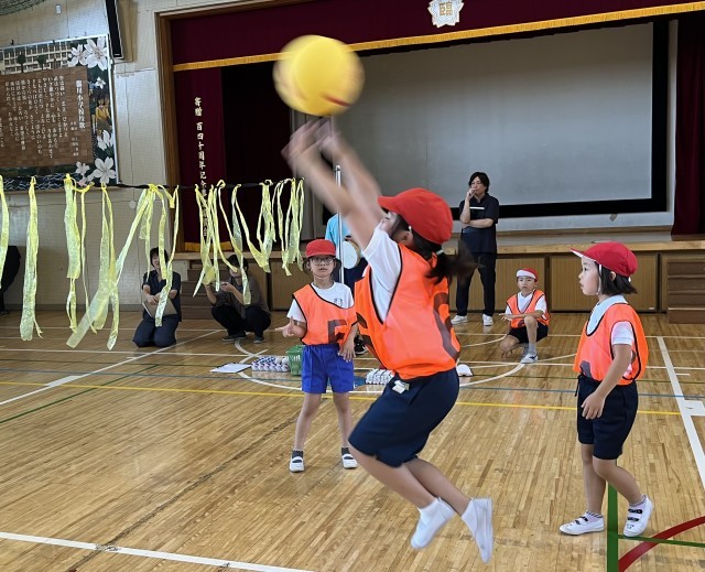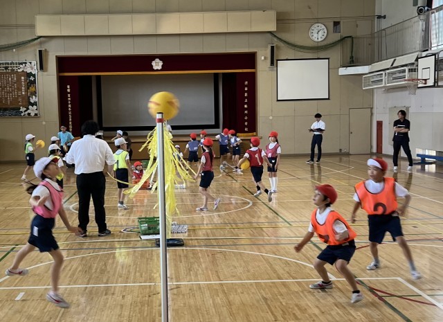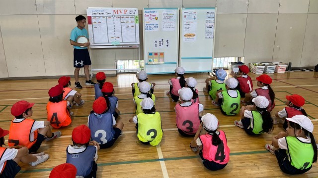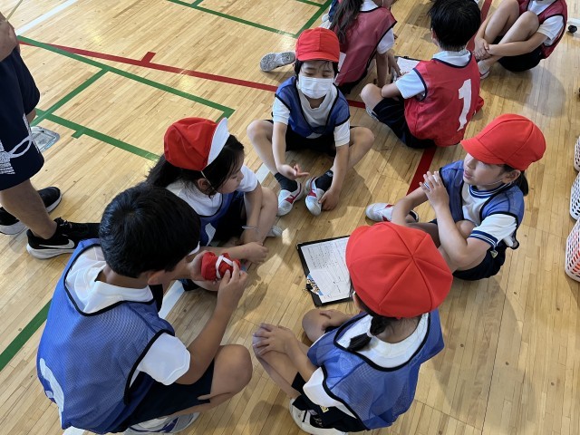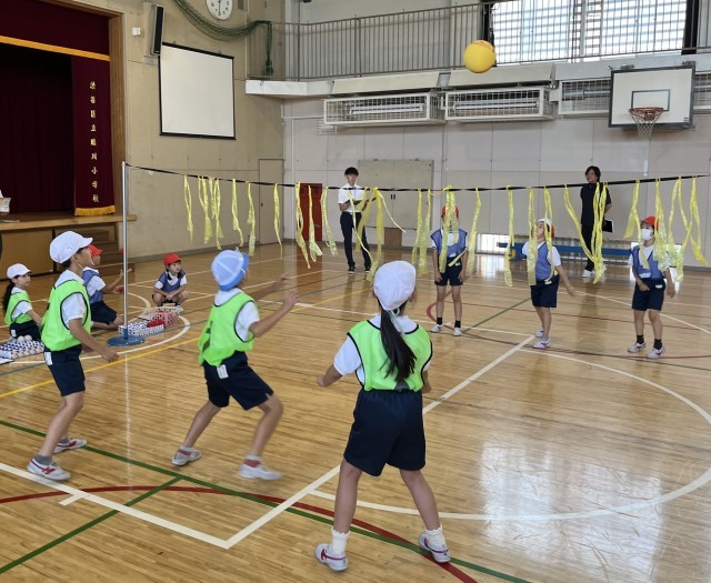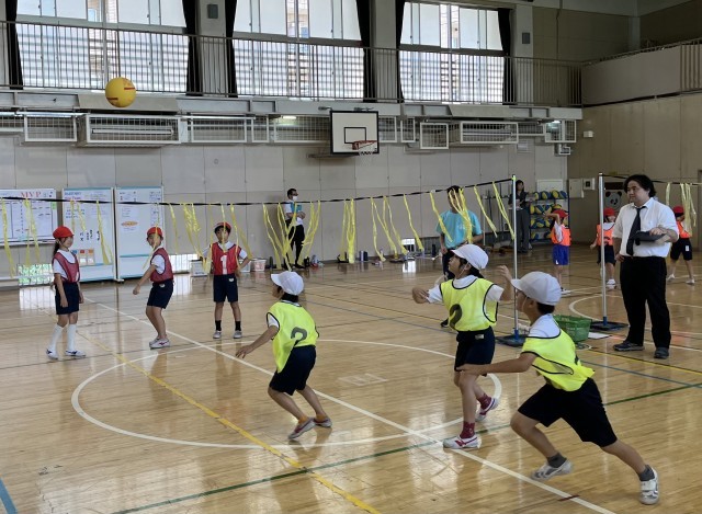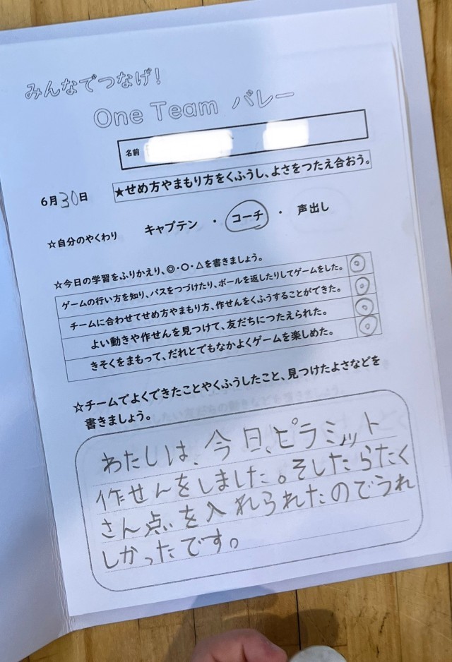 ゲーム領域のネット型「One Team バレー」を行いました。チームでめあてや作戦を決め、協力して練習やゲームを行いました。今回は全員が何かの役割(キャプテン、コーチ、声出し)をもって取り組みます。毎回その役割が変わります。ルールを工夫し、声をかけ合って楽しいゲームができました。