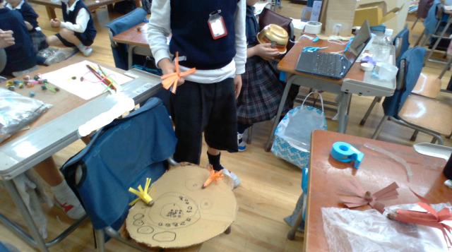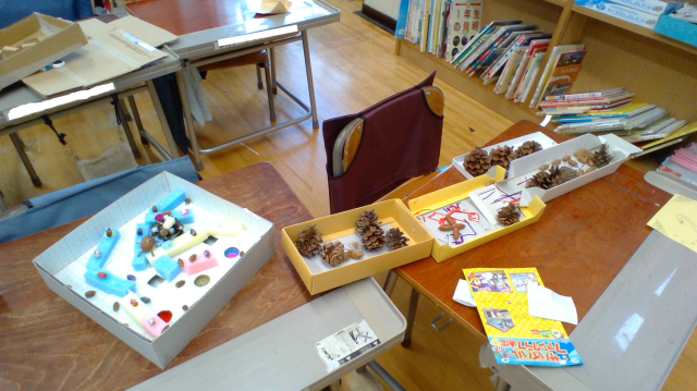 ドングリや松ぼっくりなど、自然の材料をいかして、「たのしくあそべるおもちゃ」をつくります。一人一人が自分の思いを表現しようとそれぞれが一生懸命作業しています。でも、所々で、友だちとワイワイお話ししながら楽しく活動しています。