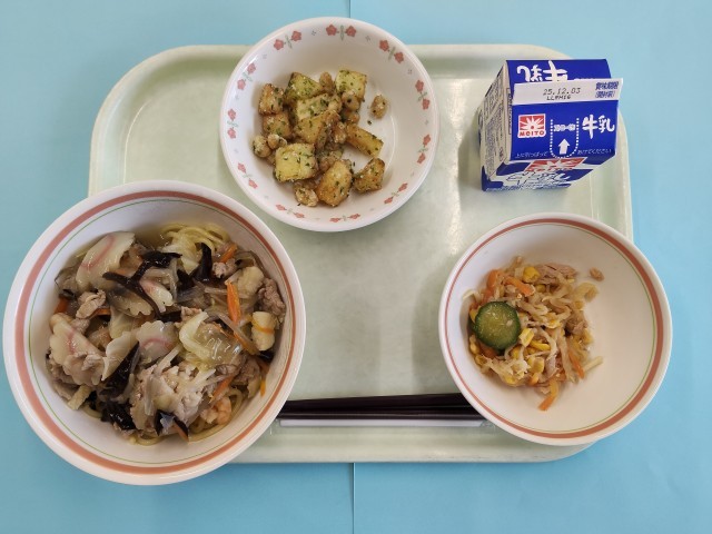 今日の給食では、「豚バラ肉、いか、えび、キャベツ、たまねぎ、もやし、にんじん、きくらげ、なると」の9つの具材を使って、長崎ちゃんぽんを作りました。いろいろな食材のうま味を味わっていただきましょう!