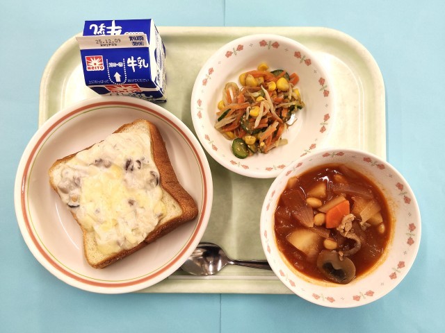今日の給食では「きのこクリームトースト」が登場していますね。きのこクリームトーストは、食パンの上に、「しめじが入ったホワイトソース」と「チーズ」をたっぷりのせて、オーブンで焼き上げて作りました。給食室での作業工程が多く、ホワイトソースも手作りをしているので、とても手間のかかる料理ですが、調理員さんたちが一生懸命作ってくださいました。