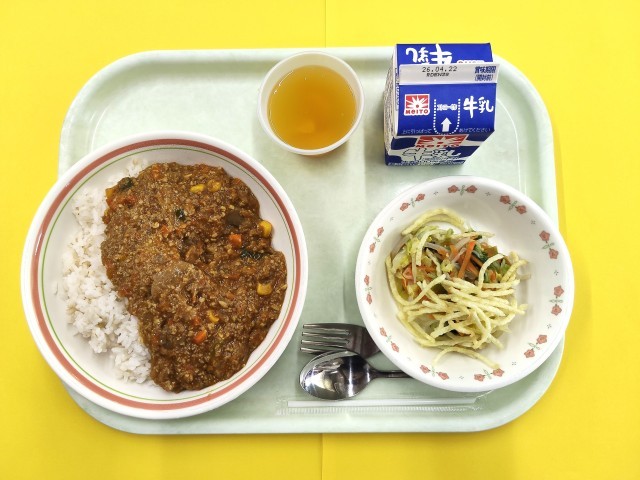 1年生のはじめての給食は、去年の給食人気投票でたくさん投票された「ドライカレー」と「パリパリじゃがいもサラダ」を作りました。ドライカレーは給食室でルーから手作りをしている自慢の一品です。また、パリパリじゃがいもサラダは、油でパリパリになるまで揚げたじゃがいもが入っている、長谷戸小で一番人気のサラダです。